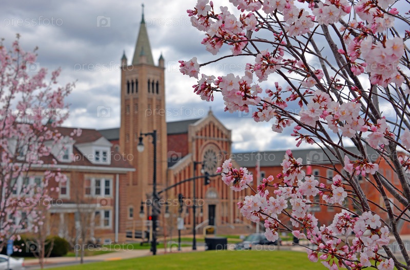 Цветущая вишня на фоне церкви