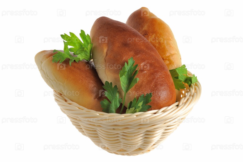 Пироги с листьями зеленой петрушки в плетеной корзине, изолированные на белом фоне