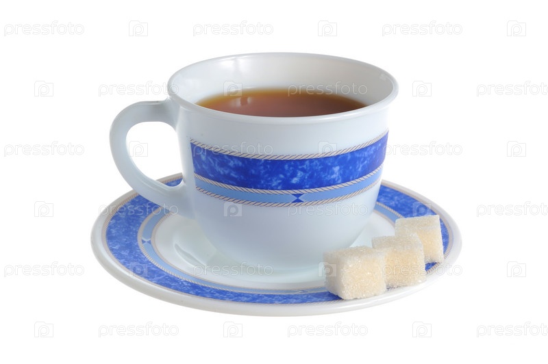 Чашка чая и сахар-рафинада на блюдце, изолированные на белом фоне