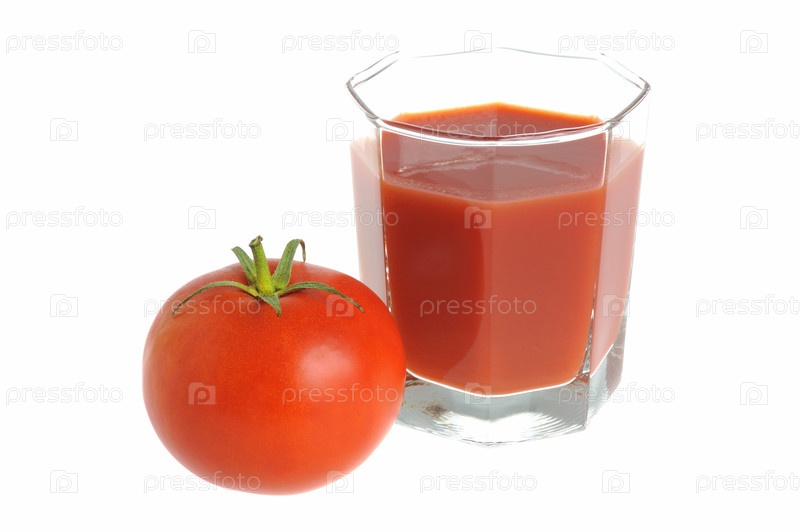 Помидор и стакан сока, изолированные на белом фоне