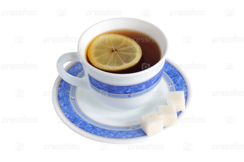 Чай с лимоном и сахаром, изолированный на белом фоне