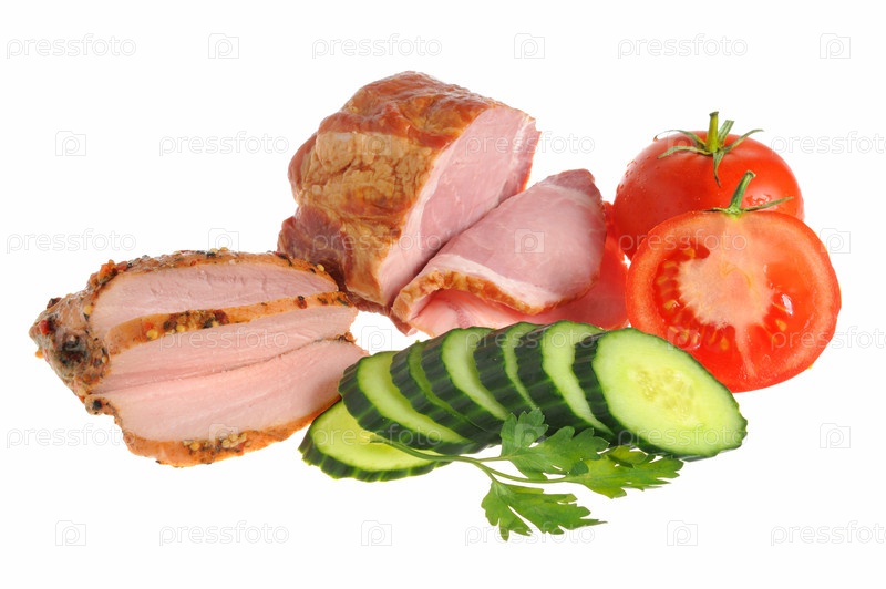 Нарезанный бекон с овощами, изолированный на белом фоне