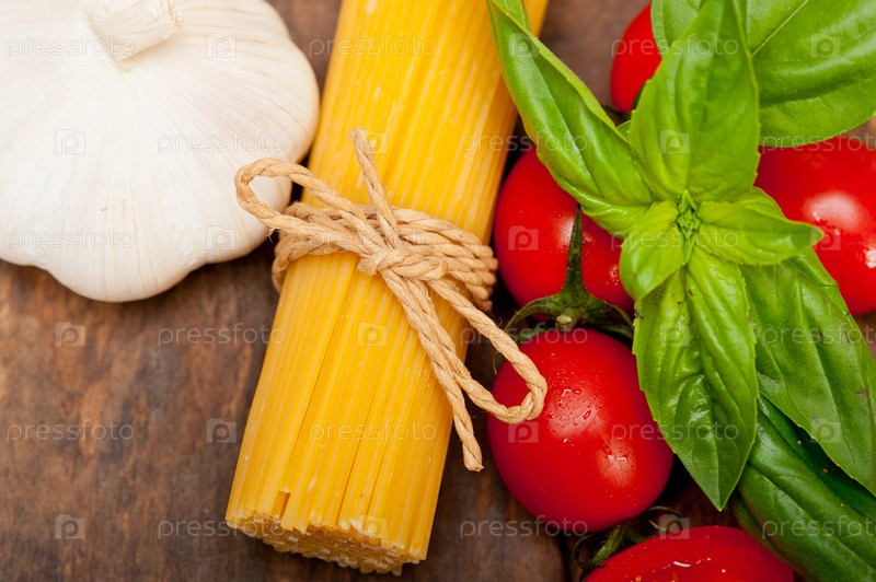 Спагетти, помидоры и базилик