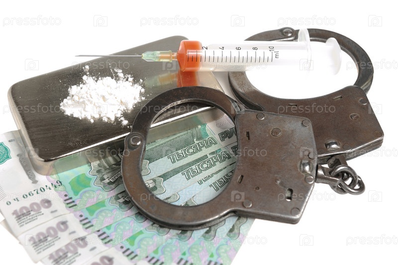 Наркотики, шприц с кровью, наручники и деньги на белом фоне