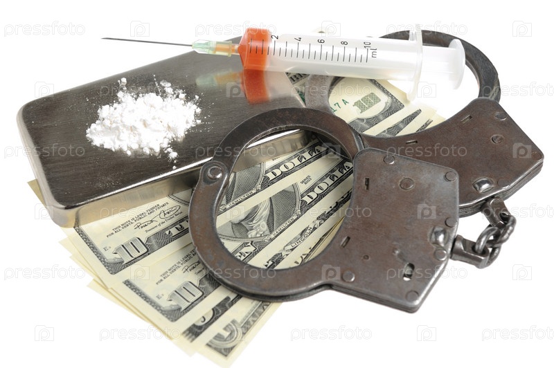 Наркотики, шприц с кровью, наручники и деньги на белом фоне