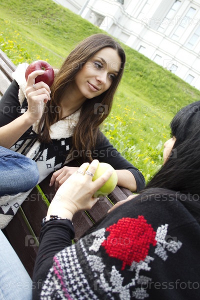Мать и дочь, сидящие в парке на лавочке с яблоками в руках