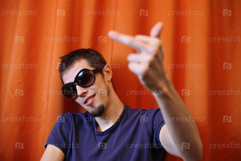 Молодой человек в солнцезащитных очках показывает средний палец в камеру