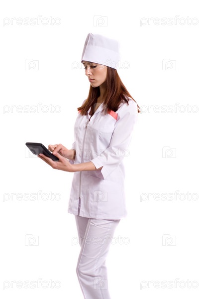 Женщина-врач считает на калькуляторе