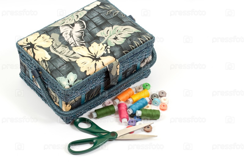 Синяя коробка, шитье и ножницы на белом фоне