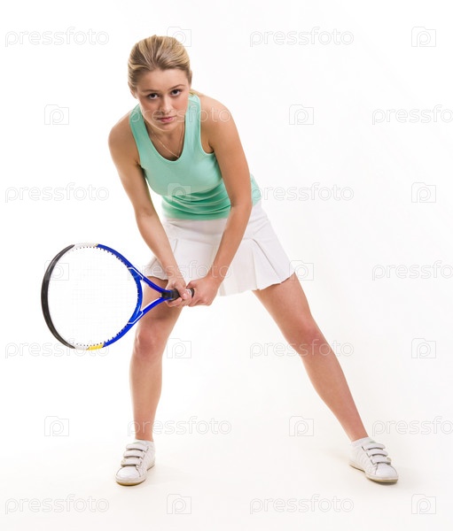 Серьезная женщина с теннисной ракетой смотрит прямо, ожидая мяча