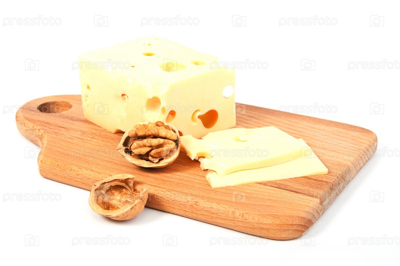 Орех с сыром на деревянной кухонной доске над белым фоном