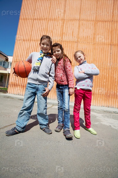 Портрет трех счастливых детей на улице