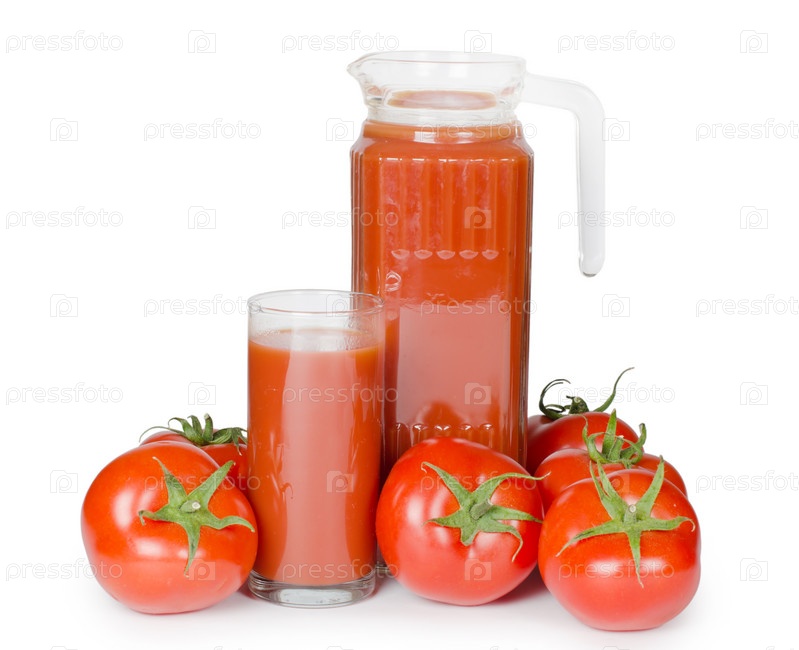 Томаты и томатный сок на белом фоне