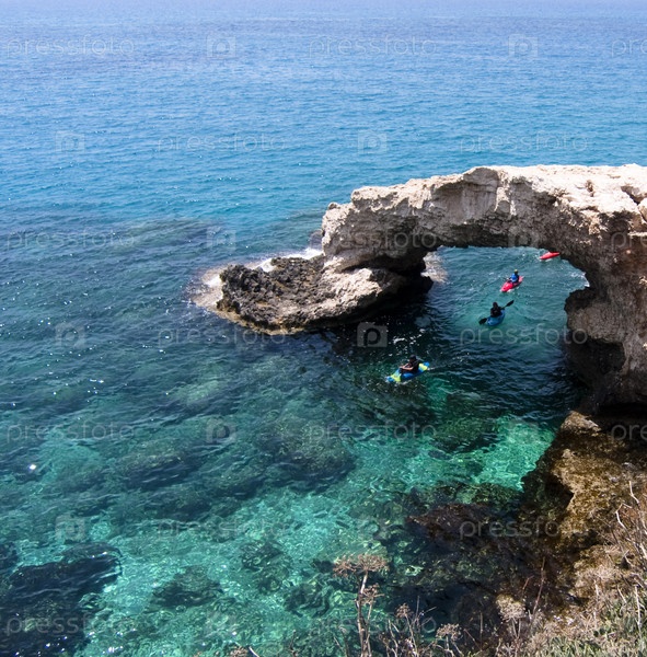 Байдарки проплывают под каменной аркой