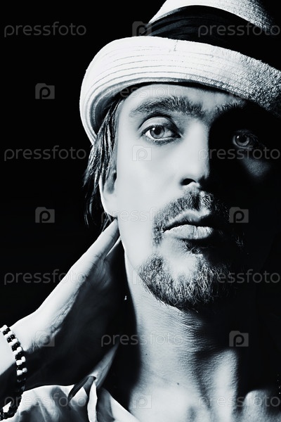 Портрет молодого человека в белой шляпе на черном фоне,