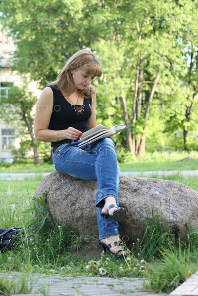Девушка с книгой сидит на камне