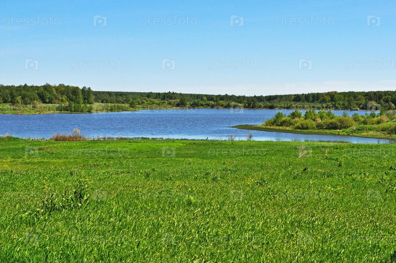 Пейзаж с видом на озеро и луг