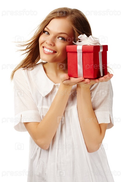 Портрет молодой девушки с подарком на белом фоне