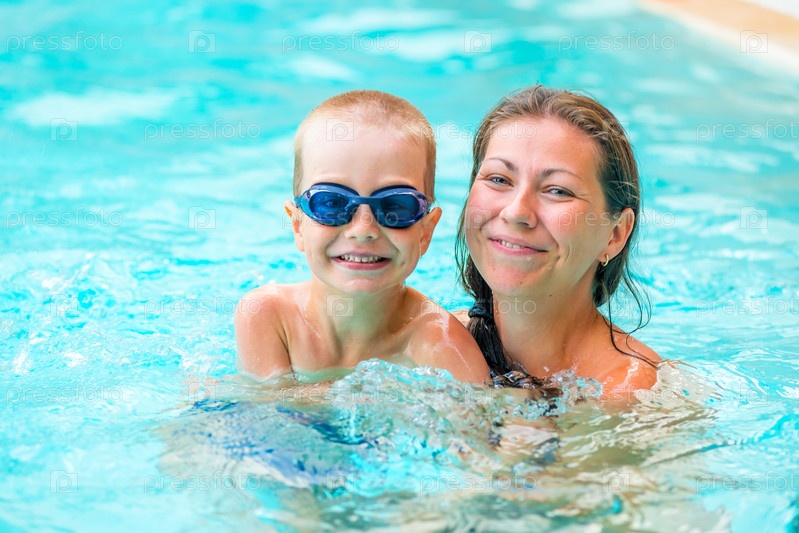 Женщина с сыном в бассейне