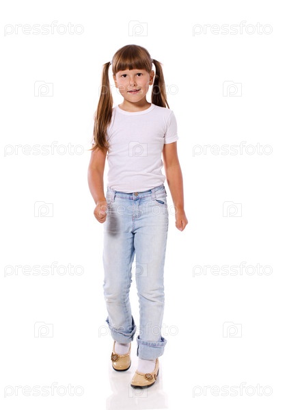 Портрет девочки в футболке и джинсах на белом фоне