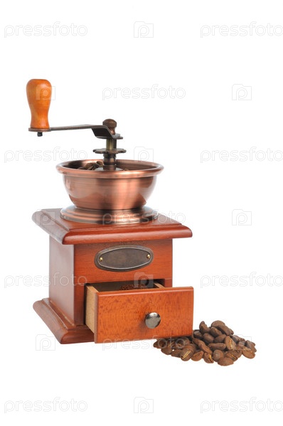 Кофемолка с кофейными зернами, изолированная на белом фоне