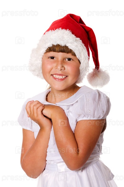 Портрет счастливой девочки в белом платье и новогоднем колпаке на белом фоне