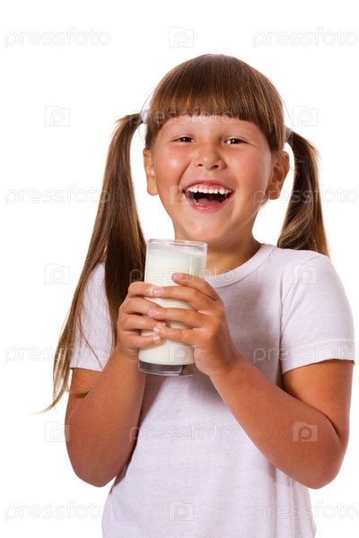 Портрет счастливой девочки со стаканом молока на белом фоне