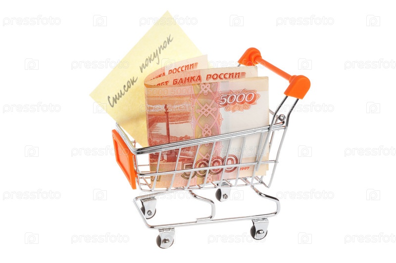 Список покупок и деньги в корзине, изолированные на белом фоне