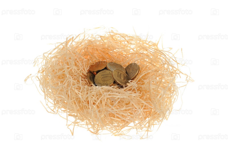 Гнездо с медными монетами, изолированное на белом фоне
