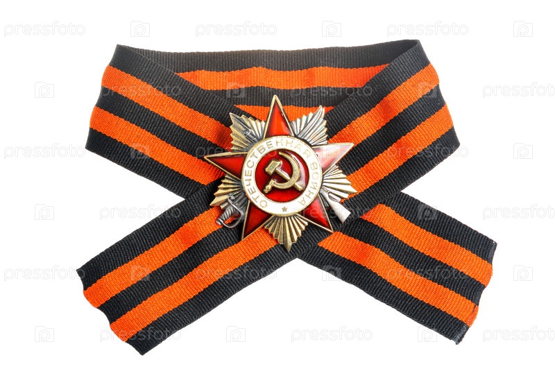 Георгиевская лента с орденом Красной звезды, изолированные на белом фоне