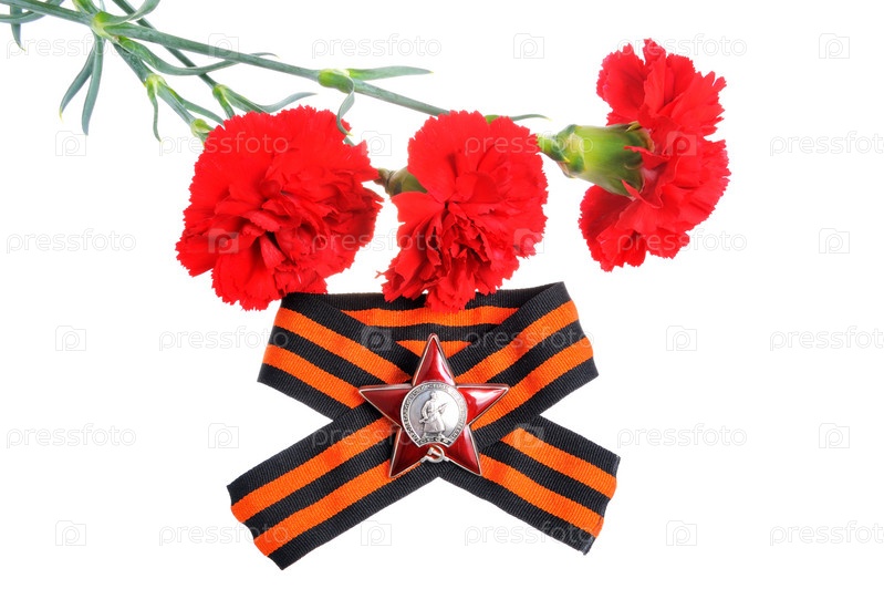 Георгиевская лента с орденом Красной звезды, изолированные на белом фоне