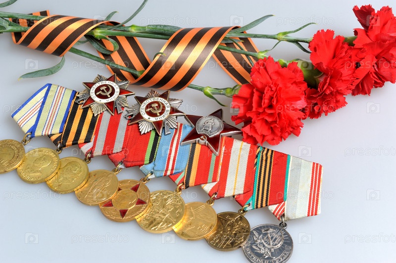 Гвоздики и медали Великой Отечественной войны с лентой Святого Георгия