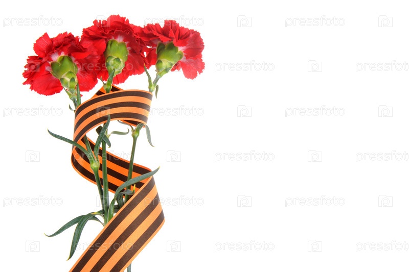 Три красных гвоздики с лентой Святого Георгия