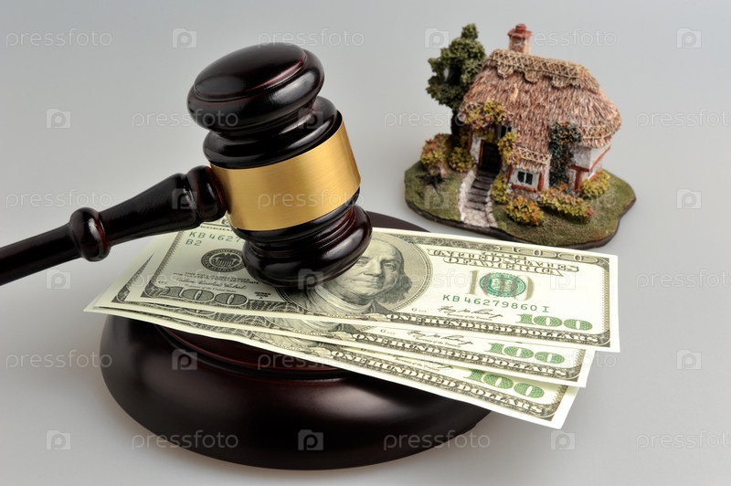 Молоток судьи с долларами и модель дома