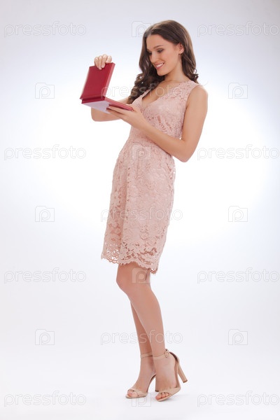 молодежный портрет молодой женщины в розовом платье счастливый дорогой подарок