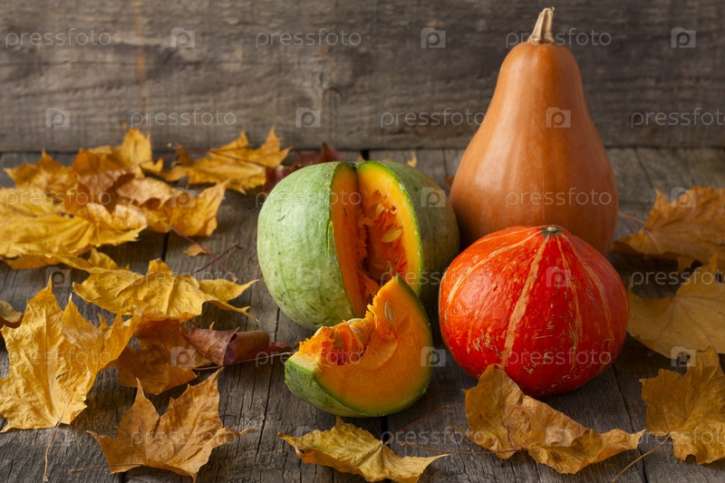 Три тыквы разных цветов на деревянном столе с осенними листьями
