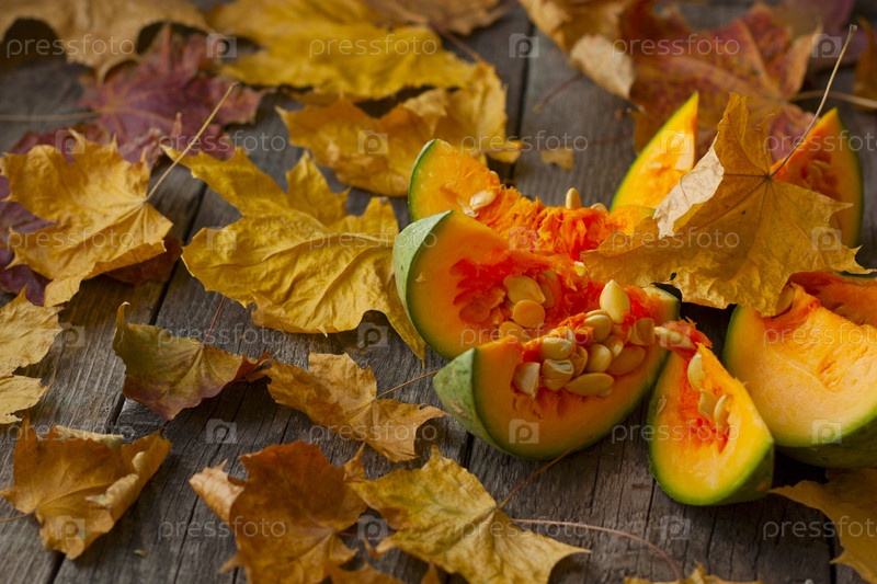 Куски тыквы на столе с осенними листьями