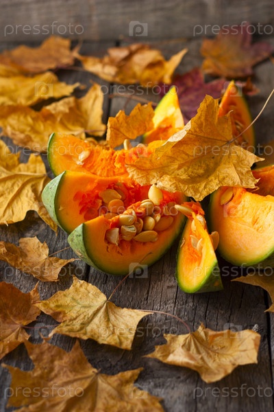 Куски тыквы на столе с осенними листьями