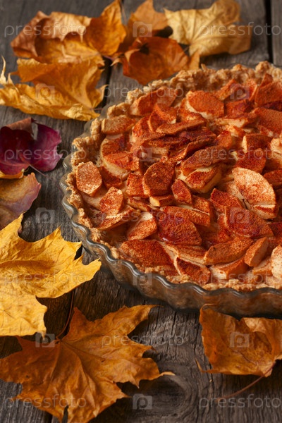 Яблочный пирог с корицей на столе с осенними листьями