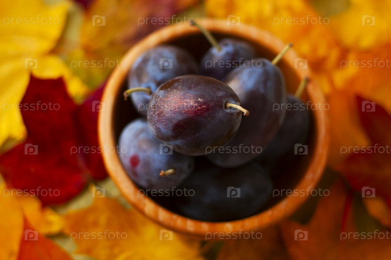 Свежие сливы в деревянном горшке на фоне осенних листьев