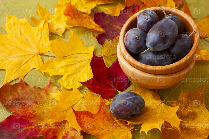 Свежие сливы в деревянном горшке на фоне осенних листьев