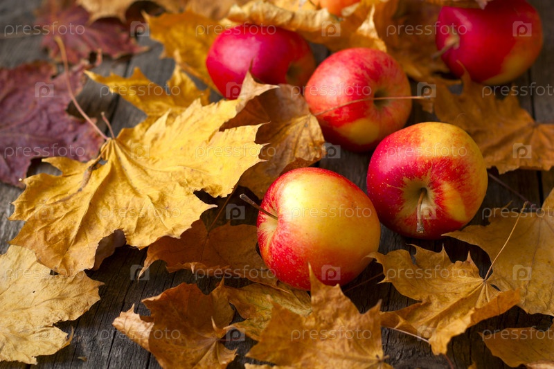 Свежие яблоки на столе с осенними листьями