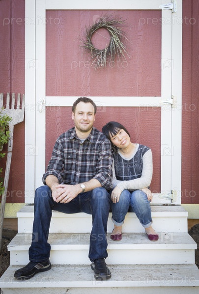 Семейная пара сидит на ступенях