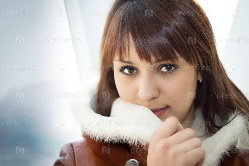 Красивая кареглазая девушка в кожаной куртке зимой на улице