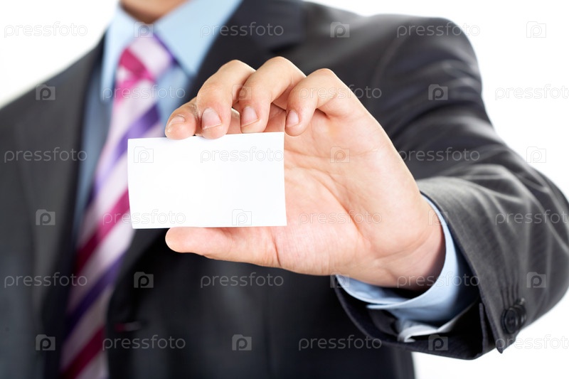 Мужчина в деловом костюме с белой карточкой в руке
