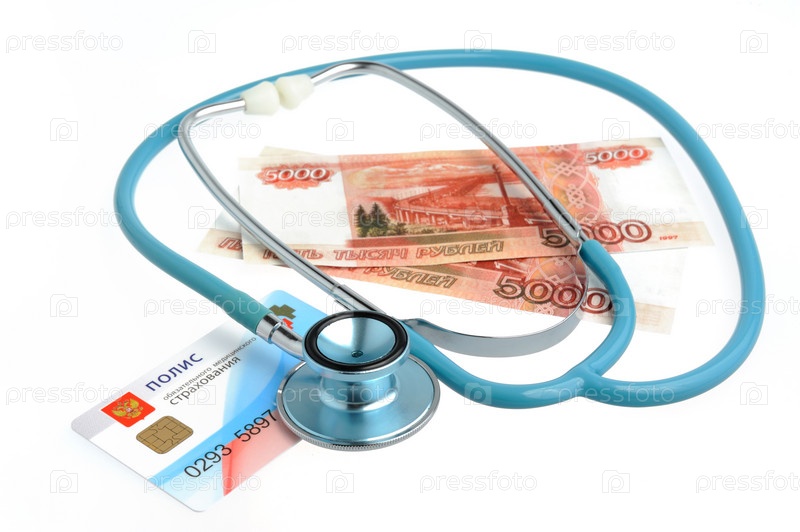 Стетоскоп, деньги и полис медицинского страхования, изолированные на белом фоне