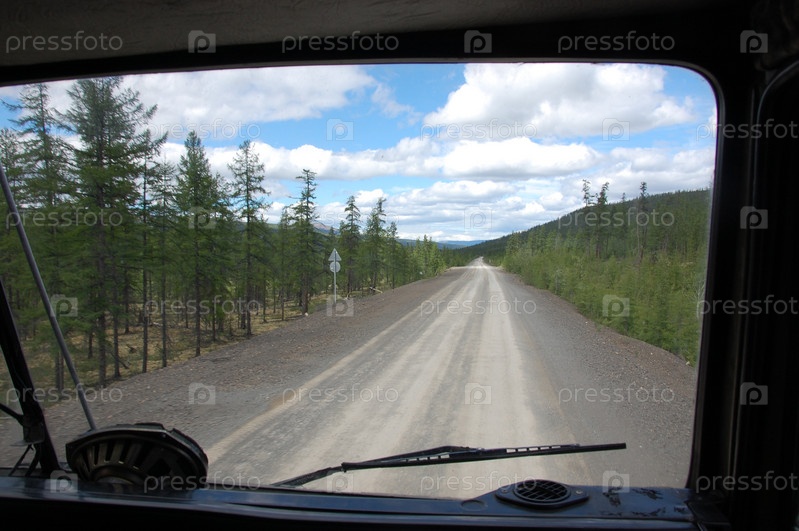 Вид из грузовика на гравийную дорогу, Колыма
