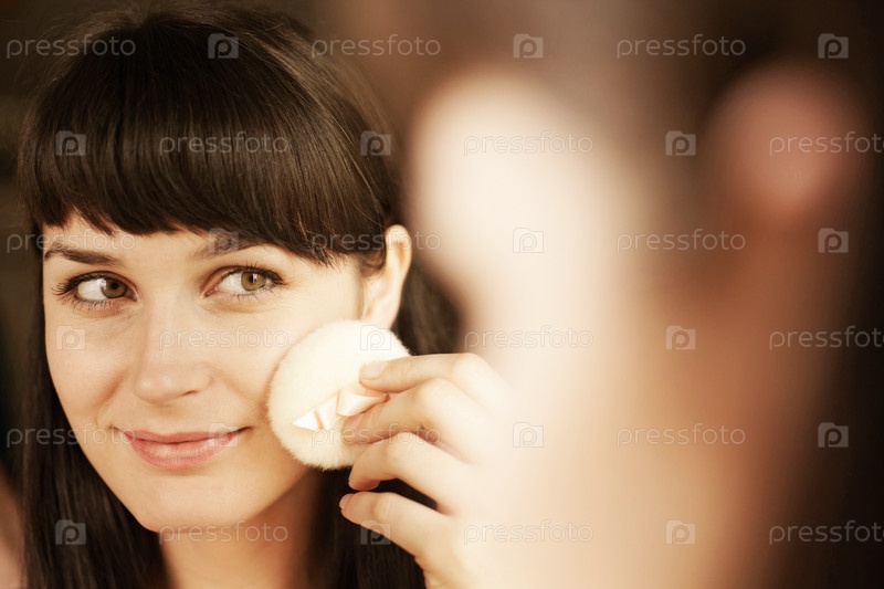 Молодая брюнетка пудрит лицо перед зеркалом