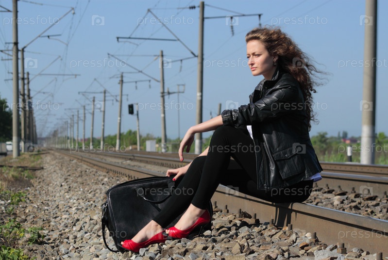 Девушка сидит на железнодорожных путях в ожидании поезда