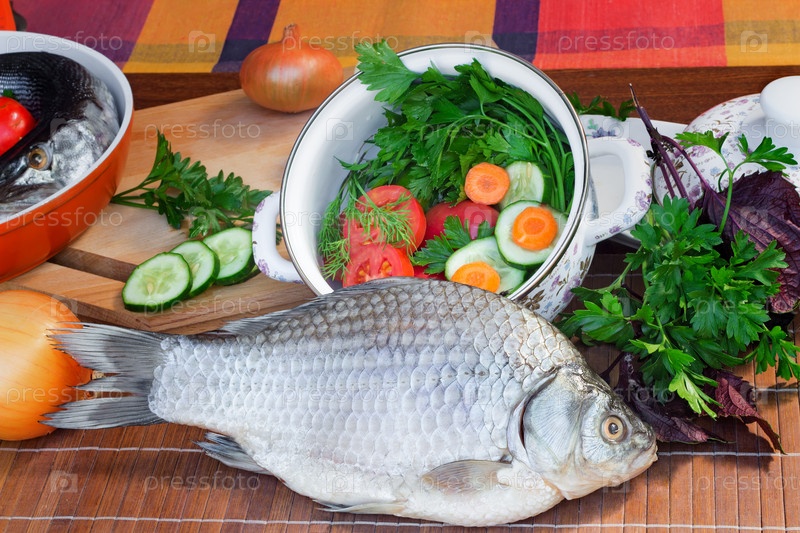 Рыба и компоненты для ее приготовления: овощи, специи, петрушка
